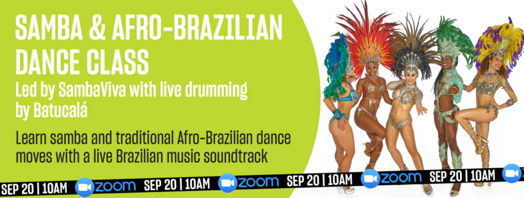 Join our local stars, Randi and Batucalá for an online all-levels samba class! Live drumming by Batucalá will enhance the energy (known as axé). Open to all levels of experience.